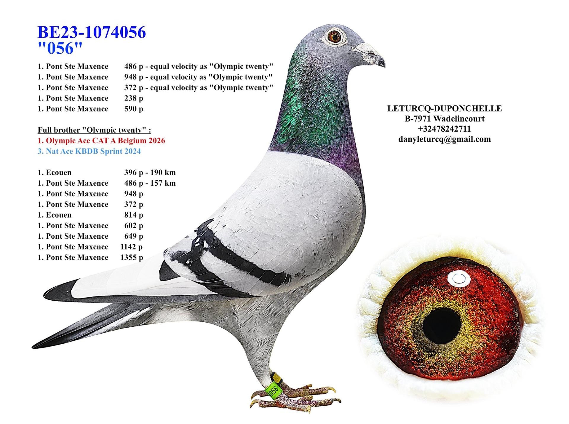 N° ring 1er Belge Pigeon Olympiades Vitesse 2026-4e Champion Vitesse pigeonneaux LCB Wallonie 2025-8e Champion Vitesse vieux/yearlings LCB Wallonie 2025-10e Général vitesse et demi-fond pigeonneaux LCB Wallonie 2025-1er As pigeon vitesse Yl EPR Ht-Bw