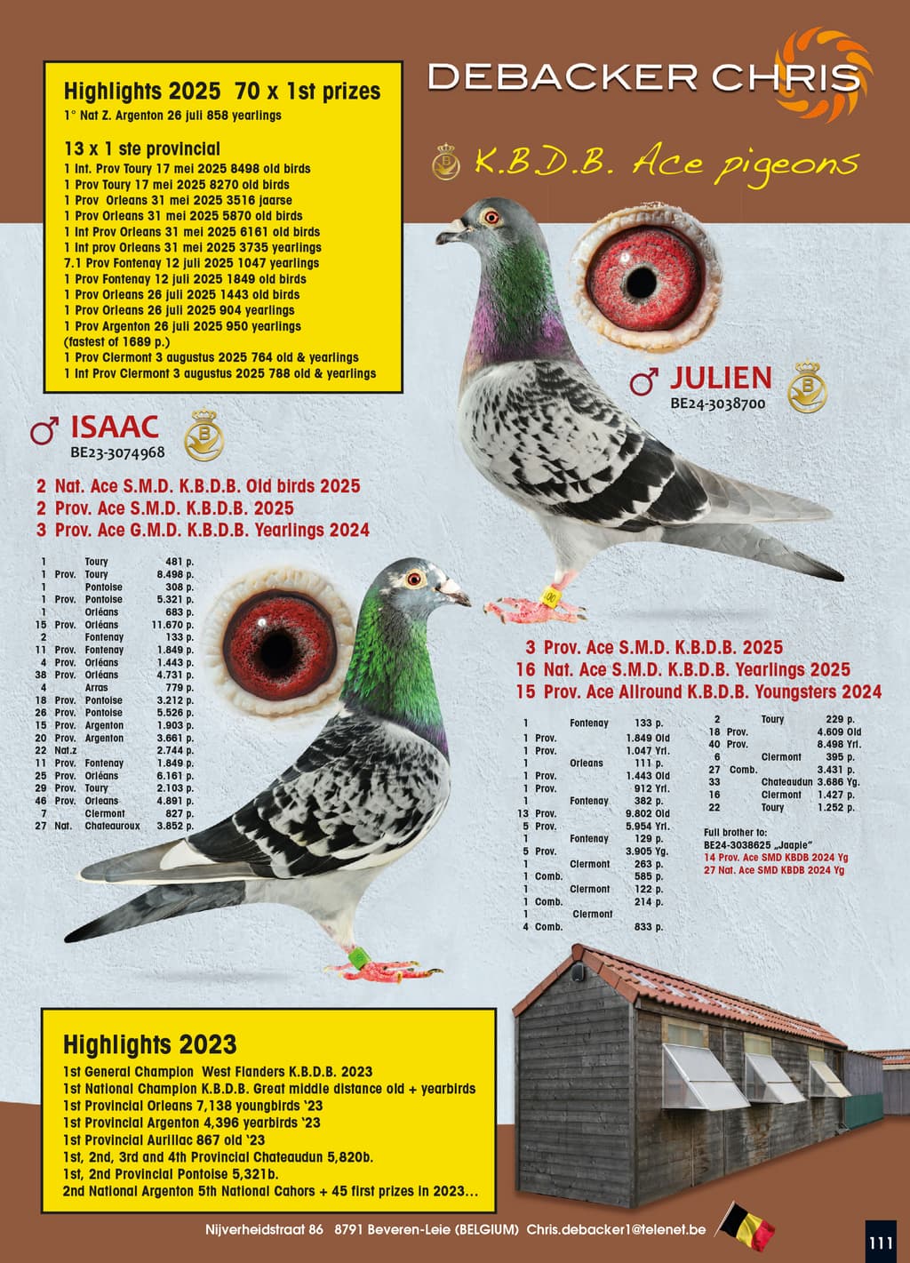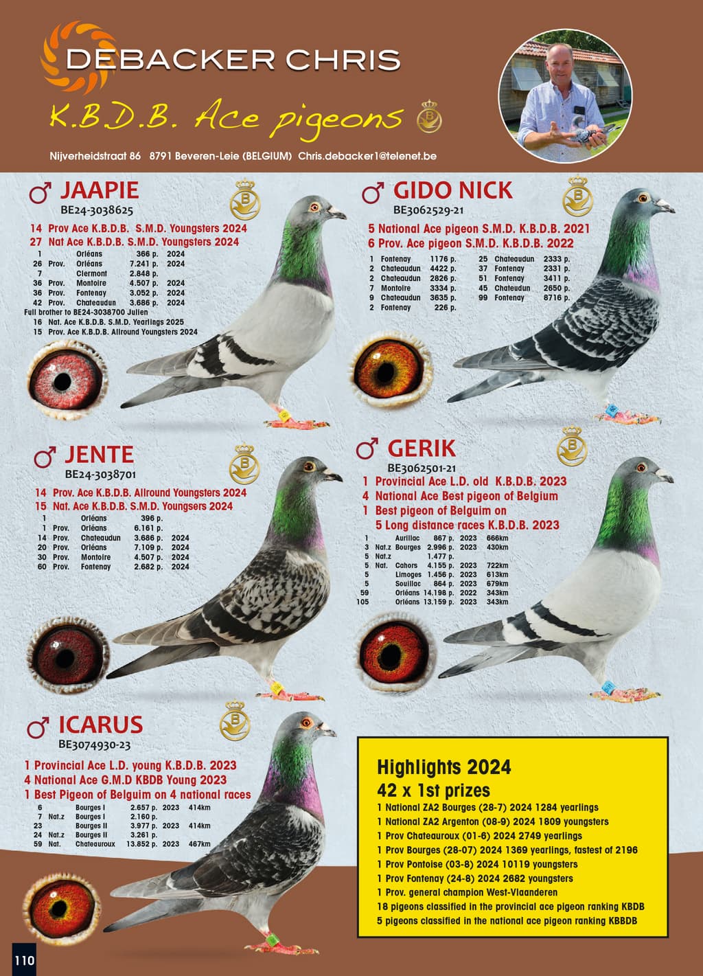 De nombreuses références Depuis plusieurs années, nombreux sont ceux qui reconnaissent la valeur de la famille de pigeons de Chris et qui ont renforcé leurs colombiers avec ces pigeons. La liste est longue, mais n'hésitez pas à interroger Jelle Roziers (Berlaar), Rik Cools (Ruiselede), Annick Goeteyn (Deinze), Anthony Maes (Waregem), Gommaire Verbruggen (Scherpenheuvel), etc., sur l'impact des pigeons Chris Debacker sur leurs colombiers. Nous pourrions allonger cette liste, mais nous sommes convaincus que de nombreux colombophiles sont déjà pleinement conscients de la qualité de ces pigeons. La preuve ultime du talent et de la performance d'un pigeon, outre ses propres exploits, reste la réussite d'autres pigeons avec ses propres pigeons. Cette satisfaction, en colombophilie, est également immense.