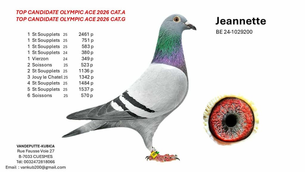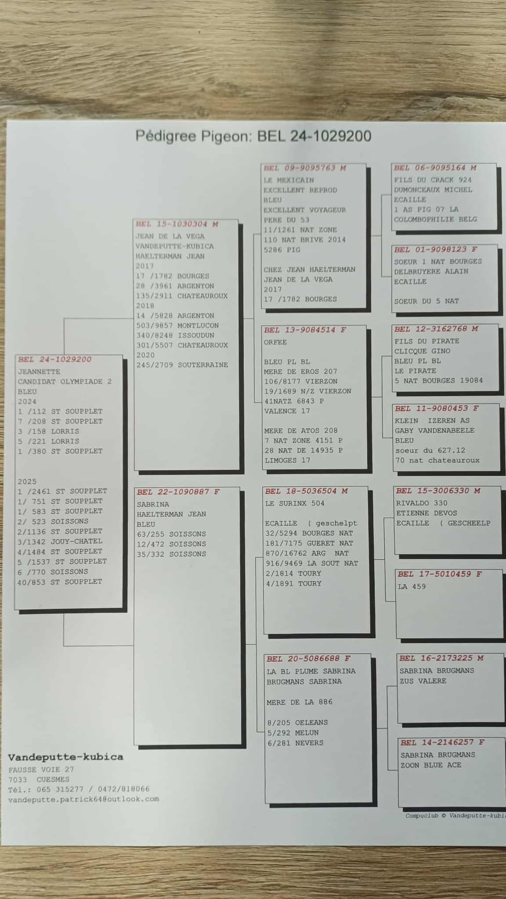 Chaque saison de fantastiques résultats avec de très hauts pourcentages de réussite prix/pigeons engagés, 2025 n'a pas dérogé à la règle!!!Les pigeons de Jean Halterman produisent de super résultats ailleurs, pour 2025 on peut citer "Jeannette" BE24-1029200 chez Vandeputte-Kubica. Cette femelle provient en grande majorité de chez Jean Haelterman. Elle est d’origine Surinx, Clicque, Brugmans, Vandenabeele... Pédigrée