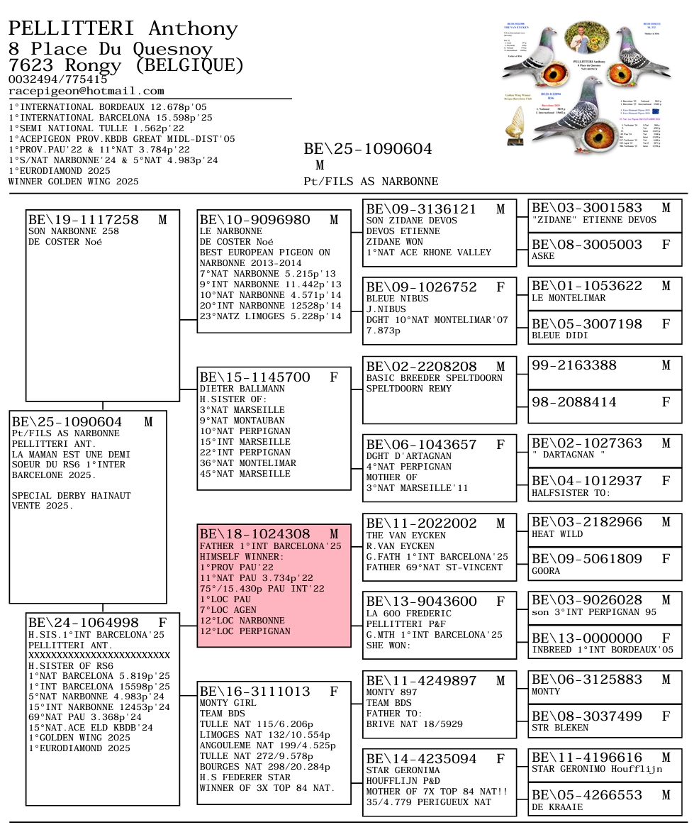 Pellitteri Anthony de Rongy pigeon sur place (Pédigré en annexe) (Derby-Hainaut) Back to the list
