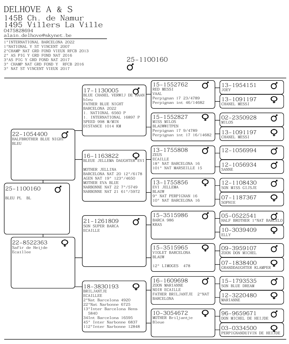 Le docteur Delhove Alain a pris pour habitude de dépenser sans compter lorsqu'il s'agissait d'acquérir du renfort. Toutes ces introductions ont un seul point commun: elles sont toutes issues des meilleures lignées. Et quand nous parlons de 'bonnes lignées', nous parlons de vainqueurs nationaux/internationaux ou bien d'as pigeons. De plus, Alain n'est jamais allé chercher des sous-produits de ces pigeons hors du commun mais bien des jeunes directement issus de ceux-ci.  Ce grand champion du Brabant Wallon nous fait l’immense plaisir de nous offrir un jeune tardif de ses reproducteurs qui sera présent en salle. Quel bonheur pour l’amateur qui en fera l’acquisition.