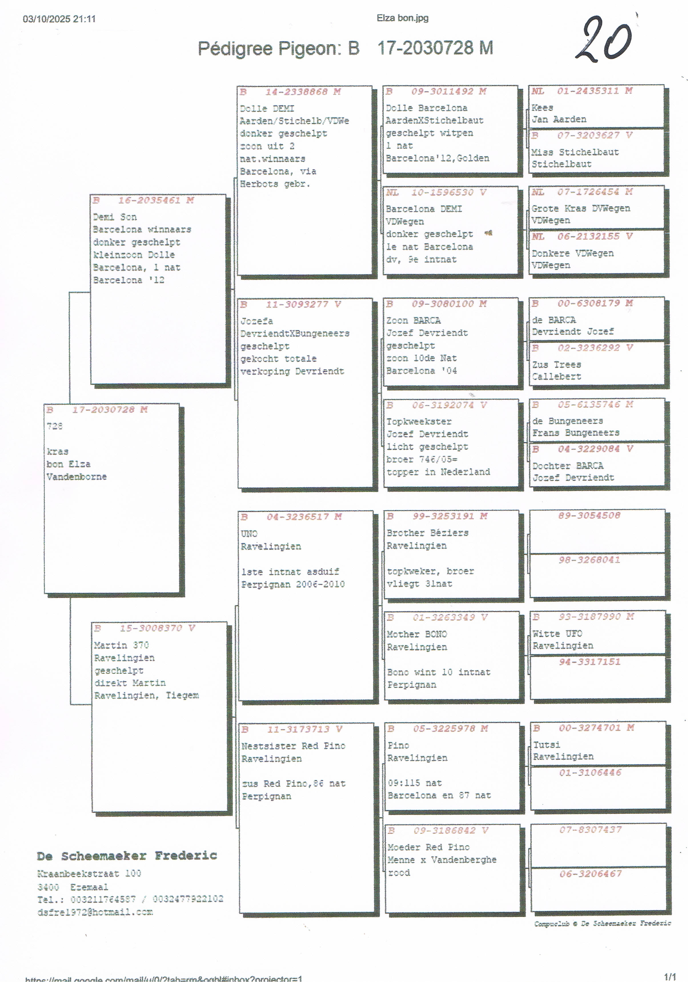 Vandeborne Elza – 1 pigeon présent – voir pédigrée Pigeon : 2030728 / 17 100 % De Scheemaeker Frédéric (Union Colombophile Virton-St Mard) Back to the list