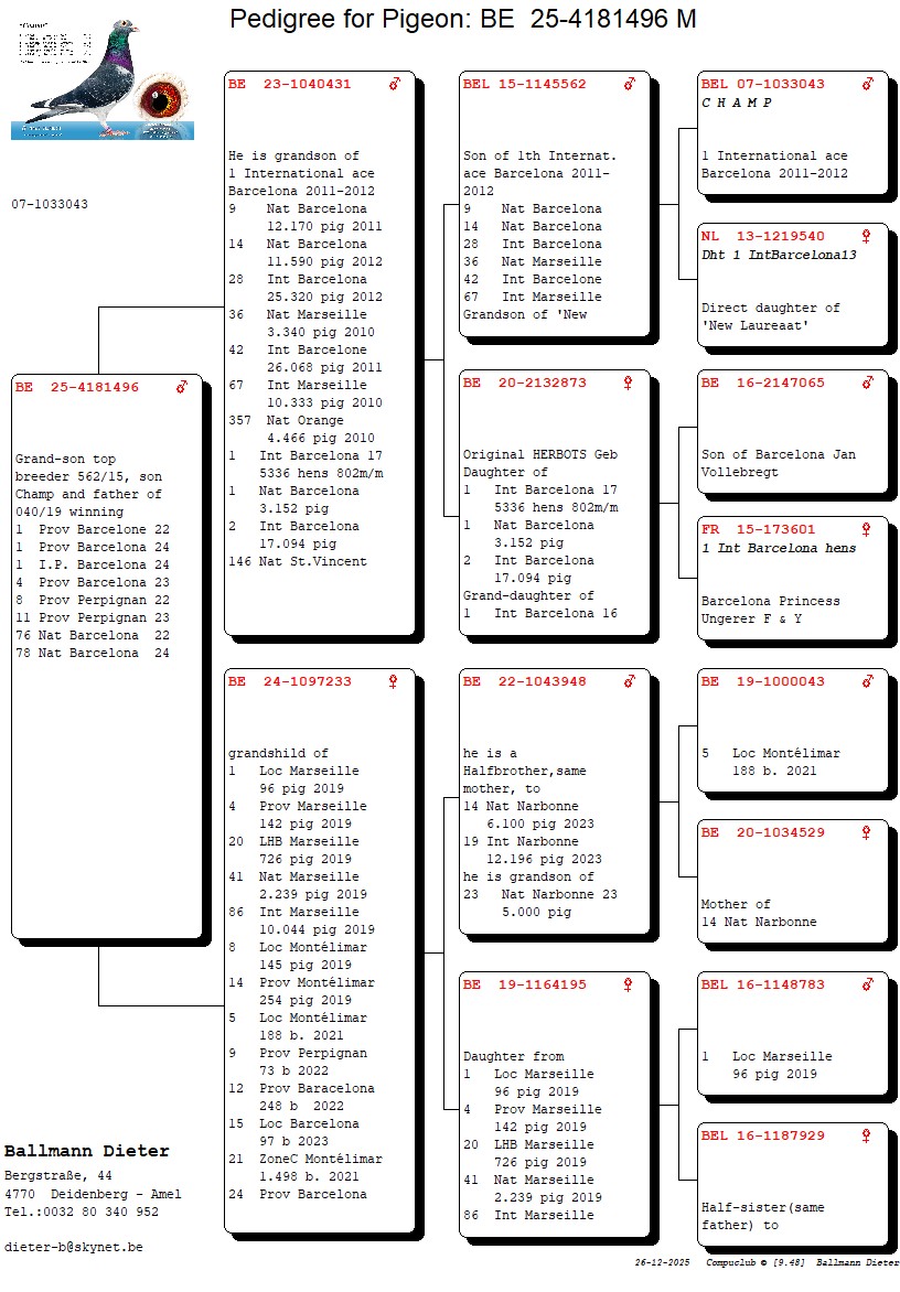 BALLMANN DIETER AMBLEVE 1 pigeon 25-4181496 (voir pedigree) Présent à la vente (Avenir & Sport Herve) Back to the list