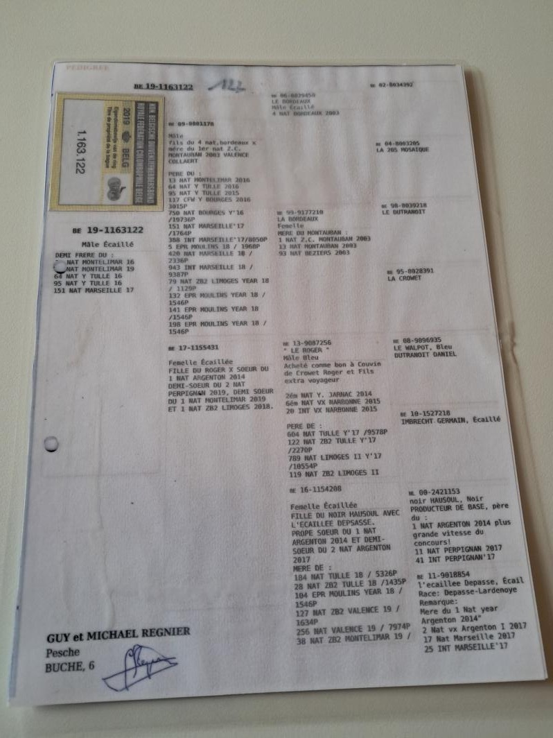 Président de Falisolle et spécialiste incontesté de Tulle où il s’y classe régulièrement en tête et où la victoire nationale ne devrait plus tarder à lui revenir, Philippe offre 1 vieux mâle présent en salle. Ce pigeon a pour origine Guy Regnier et est le père de nombreux bons pigeons chez Philippe. Il s’en sépare car Philippe ne souhaite plus détenir de pigeon qui ne vole plus chez-lui. Il serait impensable de passer à côté de cette occasion. Voir pédigrée.