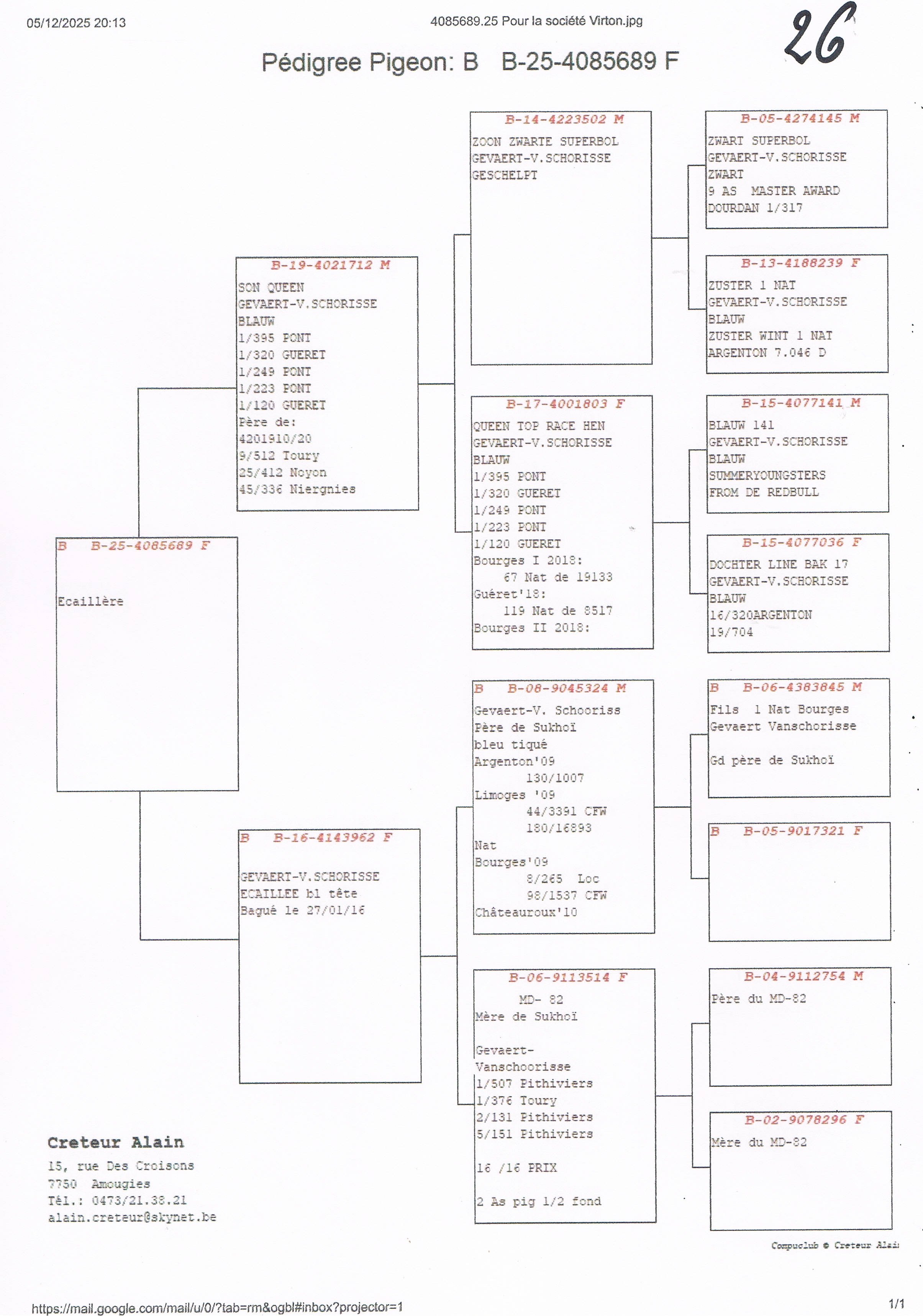 Creteur Alain – 1 pigeon présent – voir pédigrée OU 1 jeune 2026 Pigeon : 408568G / 25 100 % Gevaert -V-Schorisse (Union Colombophile Virton-St Mard) Retour à la liste