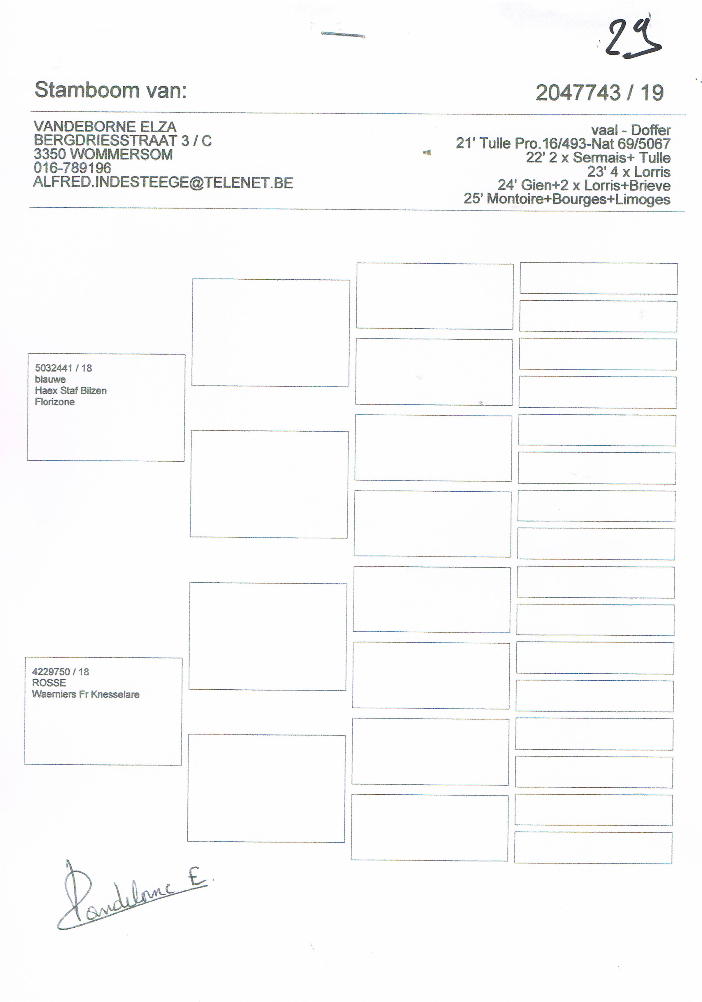 Vandeborne Elza – 1 pigeon présent – voir pédigrée Pigeon : 2047743 / 19 Orig : Florizoone X Waerniers (Union Colombophile Virton-St Mard) Retour à la liste