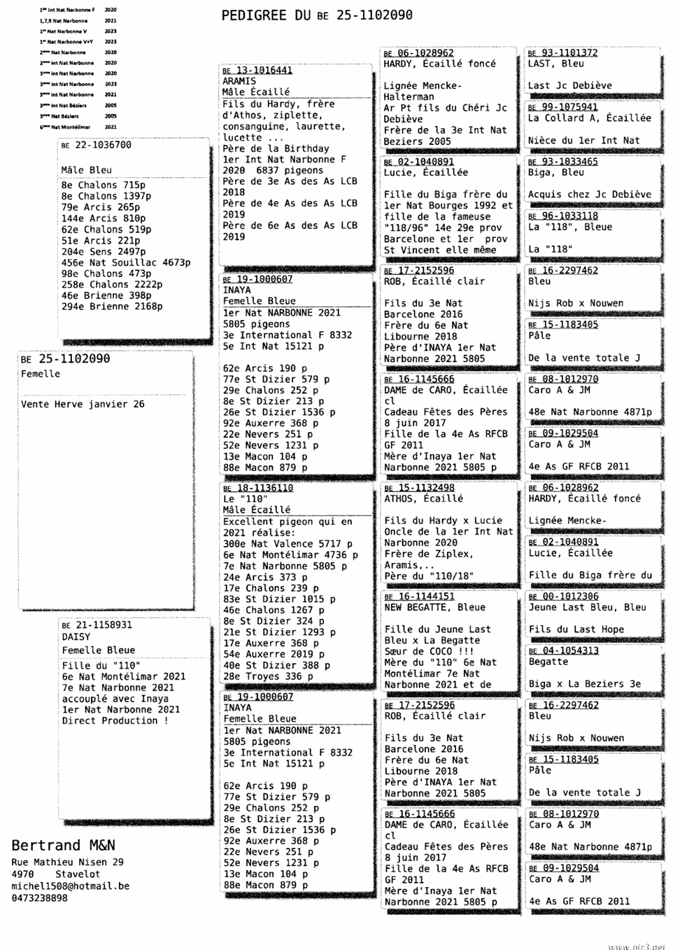 BERTRAND MICHEL STER-FANCHORCHAMPS 1 femelle 1102090/2025 voir pedigree Présente à la vente (Avenir & Sport Herve) Retour à la liste