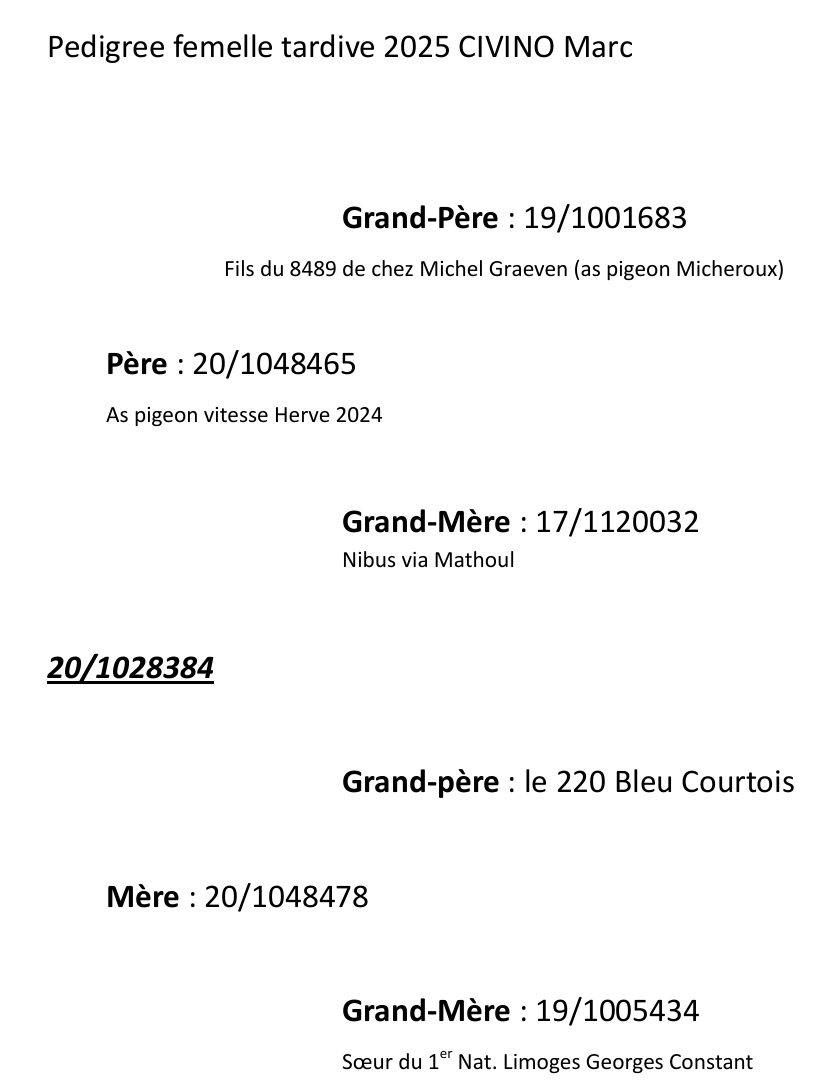 CIVINO MARC MICHEROUX II 1 femelle tardive 2025(voir Pédigree) Présente à la vente (Avenir & Sport Herve) Retour à la liste