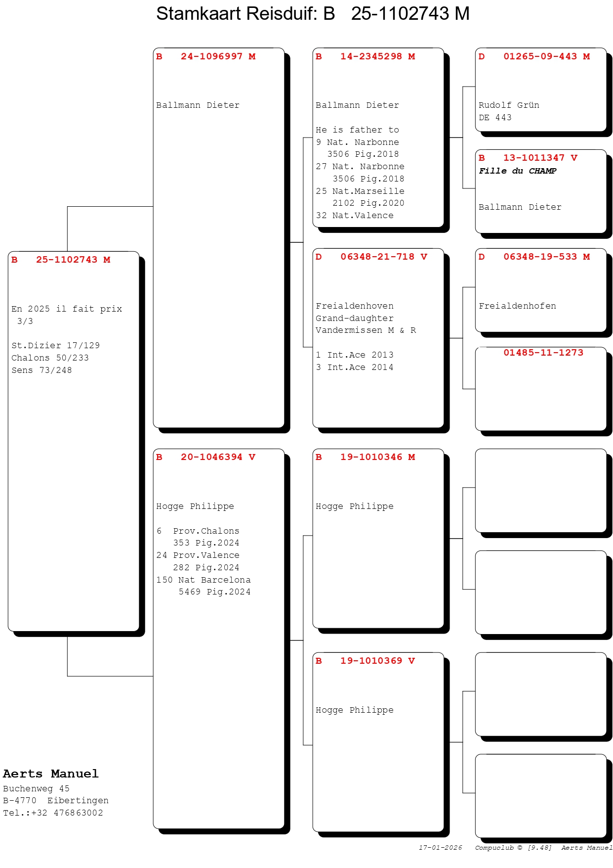 Jeune amateur qui a recommencé le sport colombophile en 2025 et qui a prouvé avec les résultats en 2025, il posséde des origines exceptionelle tel que des pigeons de chez Hogge philippe, Ballman Dieter, Smeets Pencis aux Pays-Bas, De scheemaeker Frédéric ou encore Delbushaye Cédric. Malheursement il va arrêté le sport colombophile cette année à la suite de divers soucis de santé. Il nous offre ici un mâle 2025 qui a voyagé du côté du père des origines de chez Ballman Dieter et de de la mère de chez Hogge Philippe