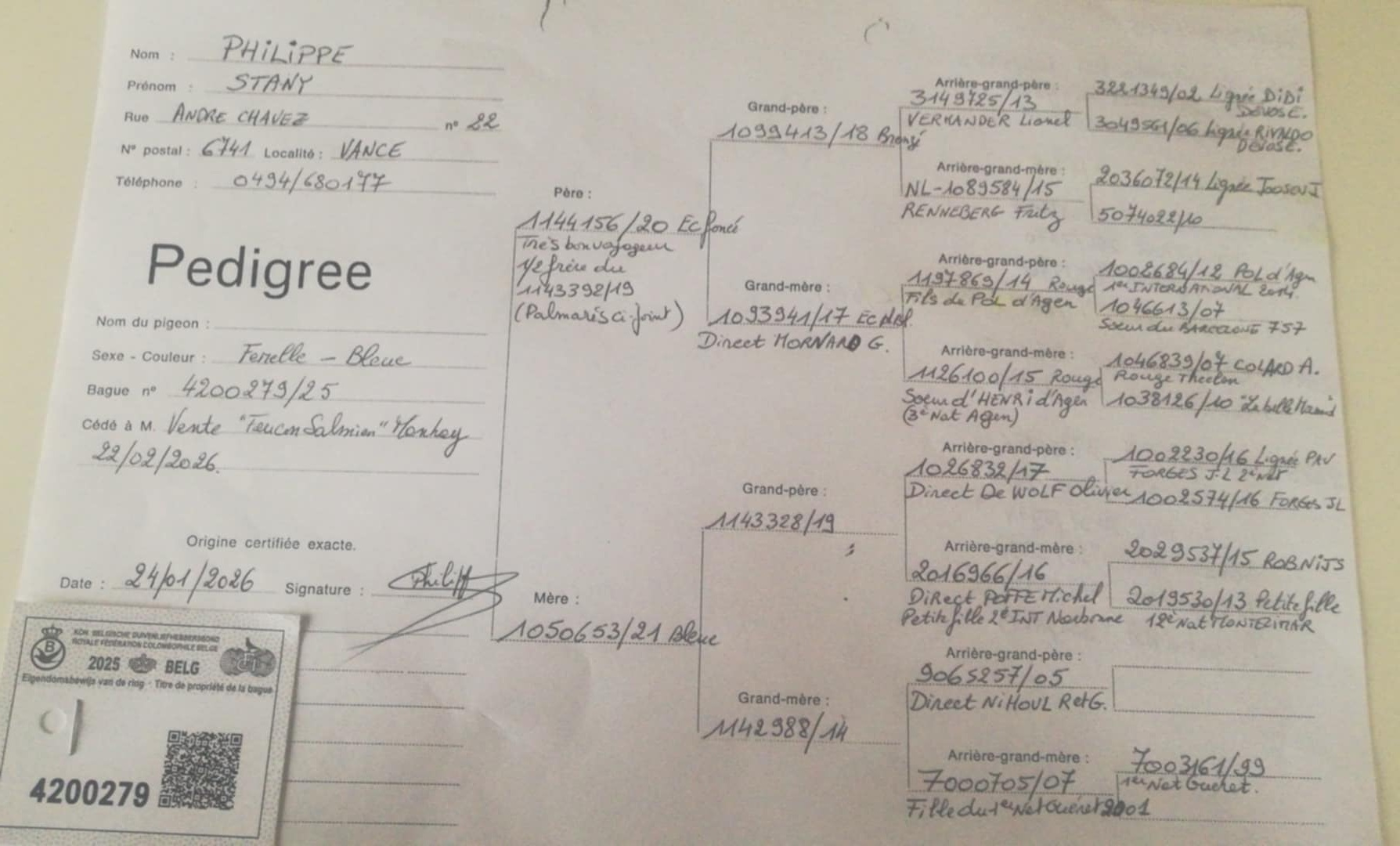 Origines : Lodewijckx R, Rans Alex, De Rijck T et G et Rans Jeroen C Stijn, Jamaigne, Marchal JM Distances : Vitesse, Demi-fond, Fond et Grand-Fond Présent sur l’ensemble de la ligne de vol, le colombier d’élevage de Stany renferme les meilleures origines de Belgique quelles que soit les distances abordées. Résultat du ½ frère du père le 1143392/19 2021 : La Souterraine Nat 1020/838, Limoge Nat 1632/6986 , Tulle Nat 743/5064 2022 Nevers AWC 3/6702 2023 : La Chatre AWC 1691/6902, Nevers AWC 286/7570, Bourges AWC 785/4762, Souillac Nat 74/4827 (3ème Zone C) 2024 Châteauroux AWC 370/4024, Vierzon AWC 342/2788 2025 : Bourges Nat 1772/18634, Sancoins AWC 1195/7721, Vierzon AWC 1497/5294, Sancoins AWC 1738/5399, Bourges Nat 517/3990, Argenton Nat 331/2049