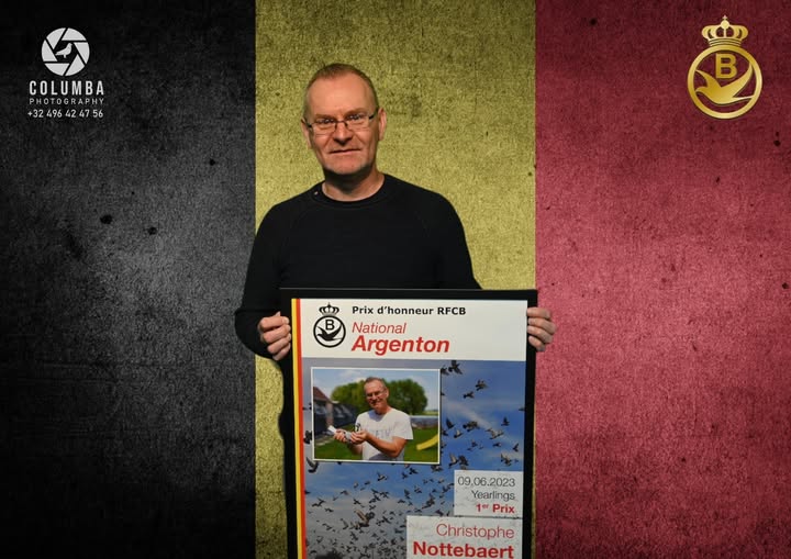 Christophe Nottebaert n'est pas inconnu des gens qui suivent les nationaux de près. Il faut dire qu'il compte déjà un nombre impressionnant de tops 10 National à son palmarès, principalement dans les concours de grand demi-fond: 1. Nat. Argenton I 17. 210 yearlings (2023),1. Nat. Châteauroux 7.099 p. (2021), 2. Nat. Châteauroux 13.086 p. (2018), 2. Nat. Bourges 10.906 p. (2010), 2. Nat. Bourges 8.424 p. (2020), 2. Nat. Guéret 5.331 p. (2018), 2. Nat. Argenton 4.782 p. (2012), 6. Nat. Bourges 10.906 p. (2010), 7. Nat. Bourges 34.311 p. (2021), 9. Nat. Montluçon 11.056 p. (2015), 10. Nat. Châteauroux 13.086 p. (2018), 10. Nat. Bourges 7.606 p. (2022), ...