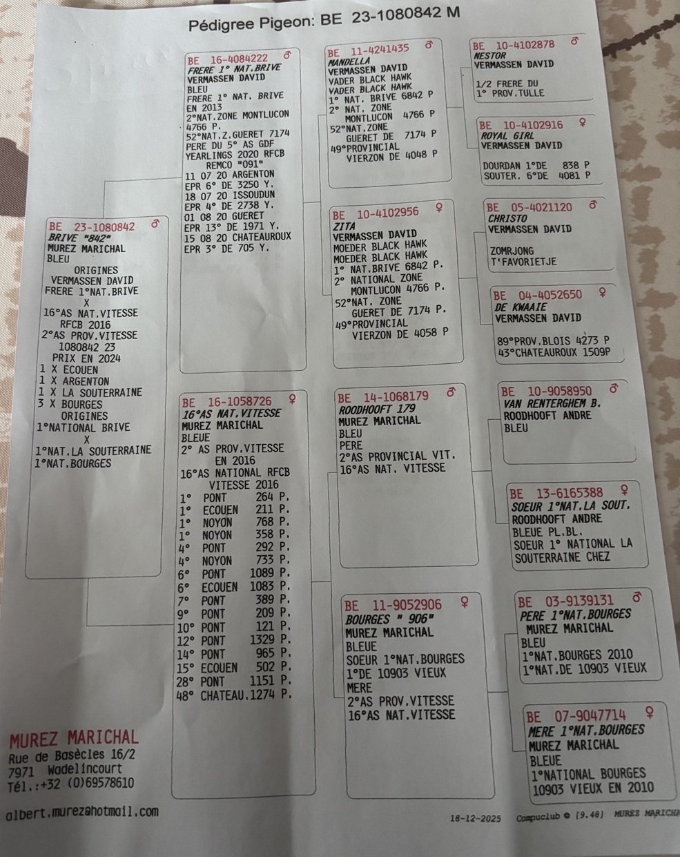 Murez-Marechal Wadelincourt 1 pigeon Sur place (Alliance Colombophile Athoise) Retour à la liste