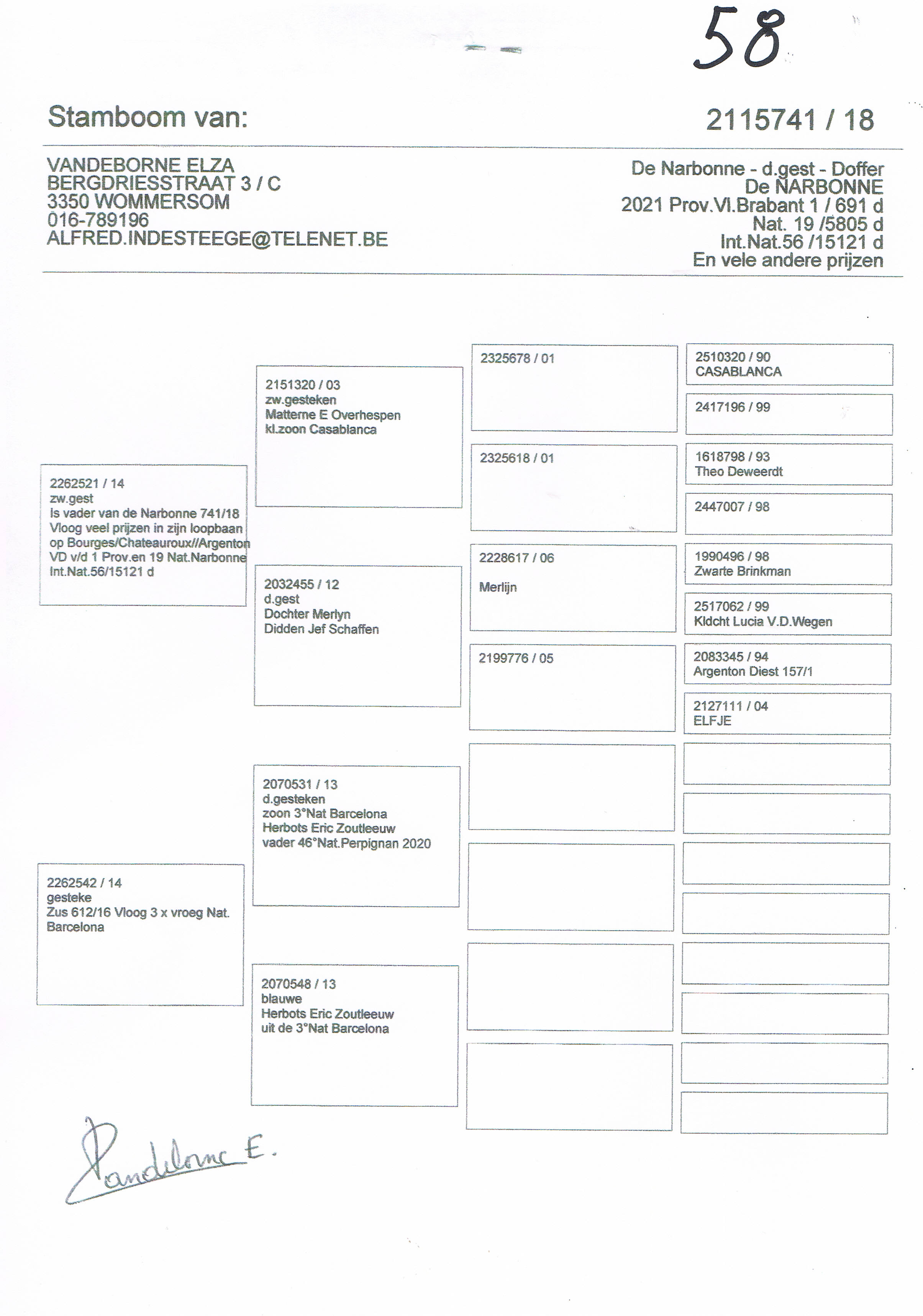 Vandeborne Elza – 1 pigeons présents – voir pédigrée Pigeon 2115741 / 18 « DE NARBONNE » 1G° Nat Narbonne 2021 (Union Colombophile Virton-St Mard) Retour à la liste