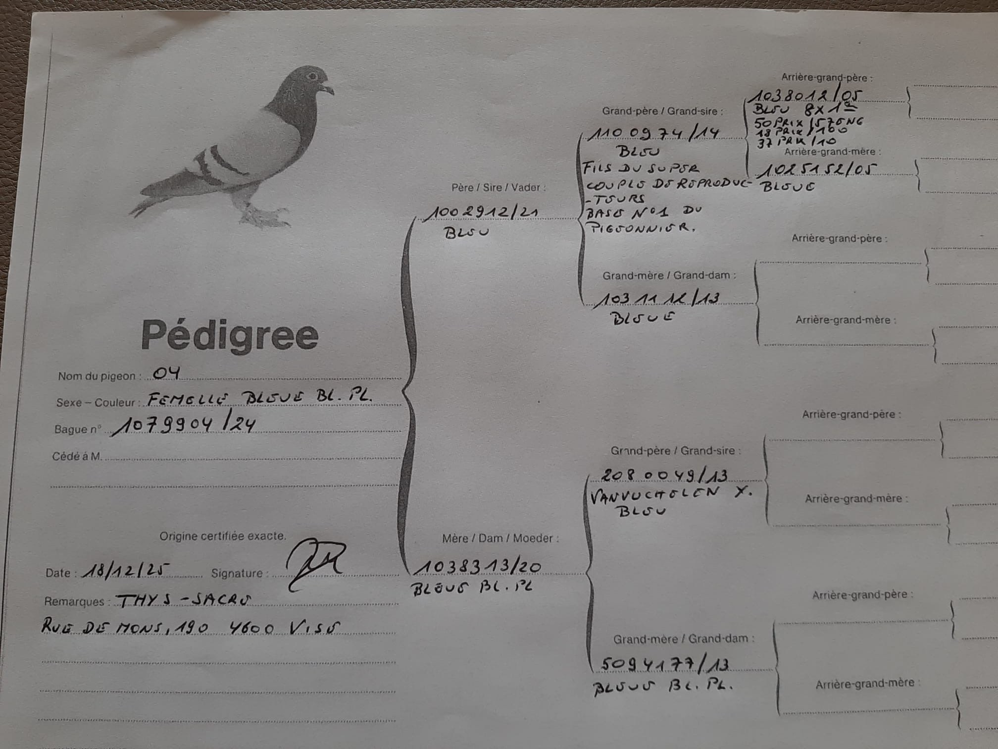 THYS-SACRE JOSEPH VISE 1 Femelle 1079904/24 voir pedigree Présente à la vente (Avenir & Sport Herve) Retour à la liste